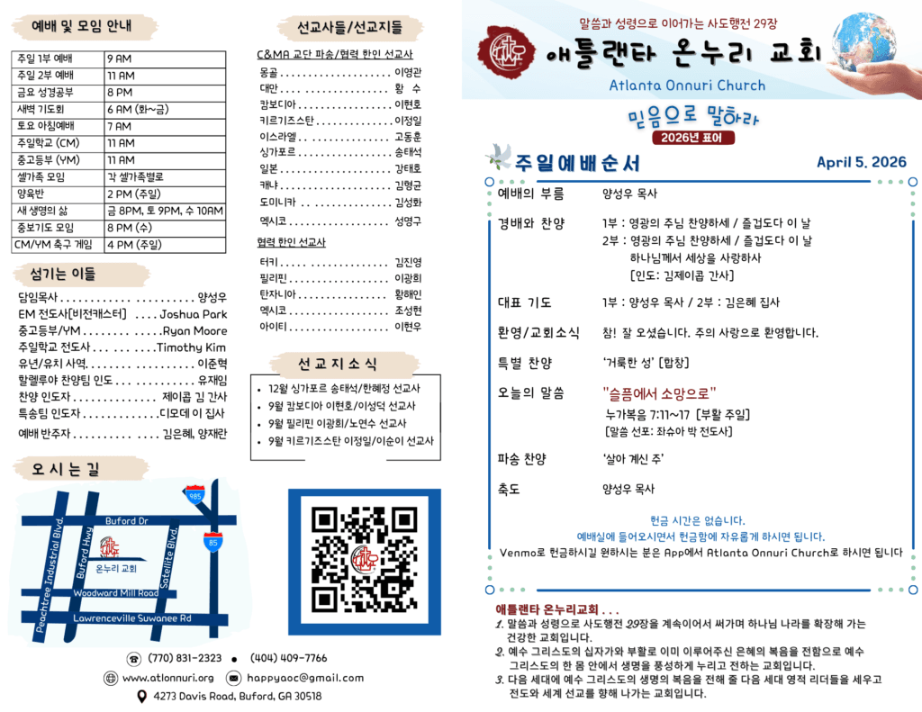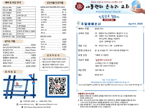 © 2013~2026 애틀랜타 온누리교회. All Rights Reserved. Powered by In & Out Web Solutions
